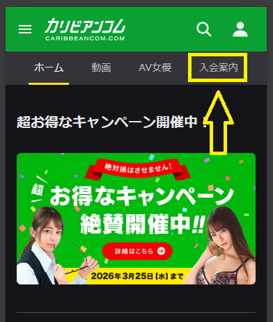 ここでは、有料アダルト動画サイトに入会する手順をカリビアンコムを例にご紹介します。